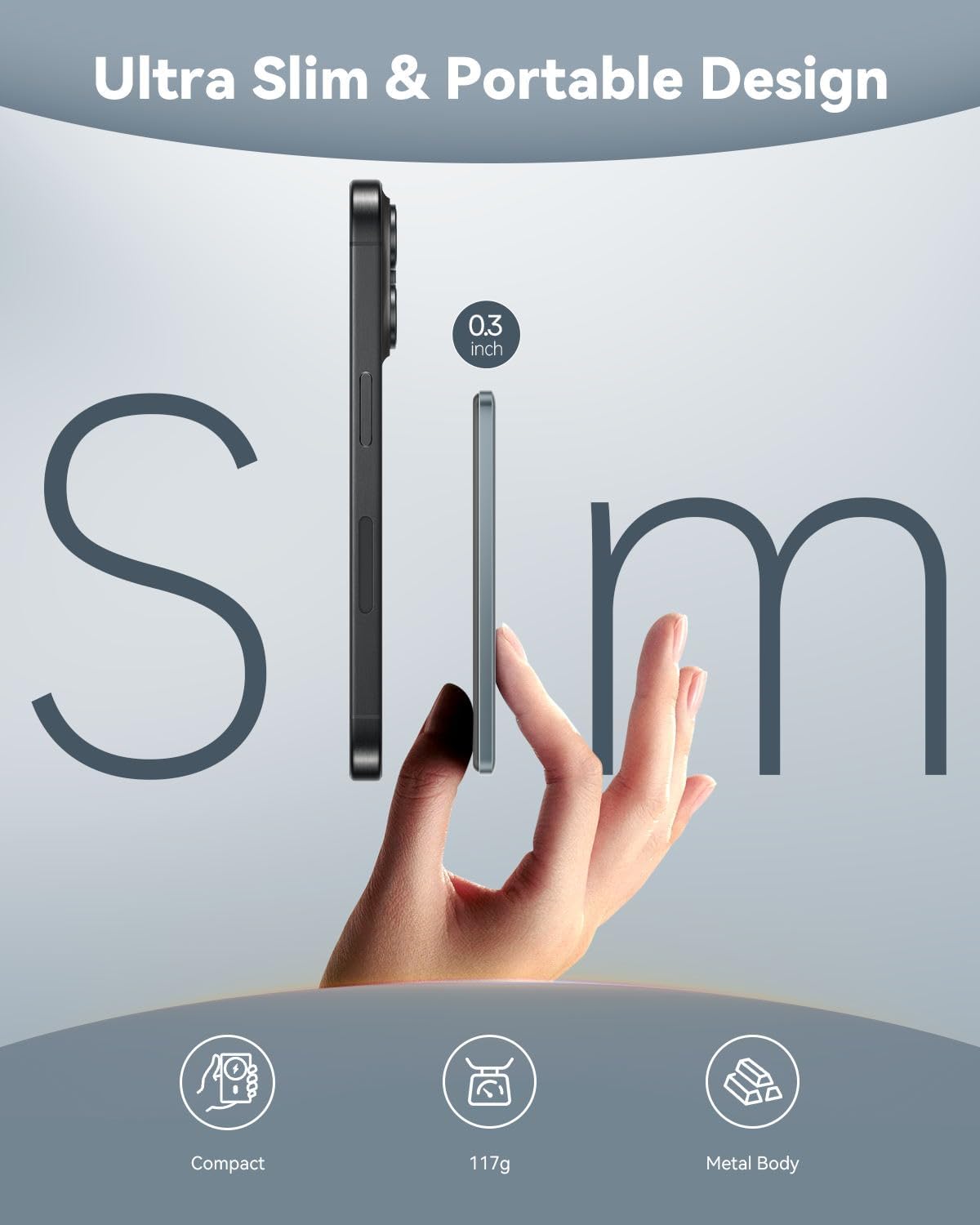 Extiende la vida de tu iPhone con esta power-bank magnética compatible con MagSafe. Diseño ultradelgado (≈0.3″) y potencia real, ideal para el día a día y momentos de alto uso.