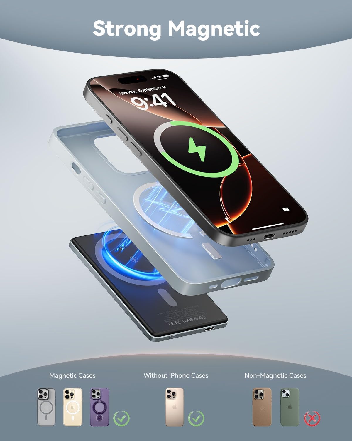 - Compatible con iPhone 16 / 15 / 14 / 13 series gracias al imán MagSafe integrado.Recarga rápida por USB-C además de la carga inalámbrica magnética.