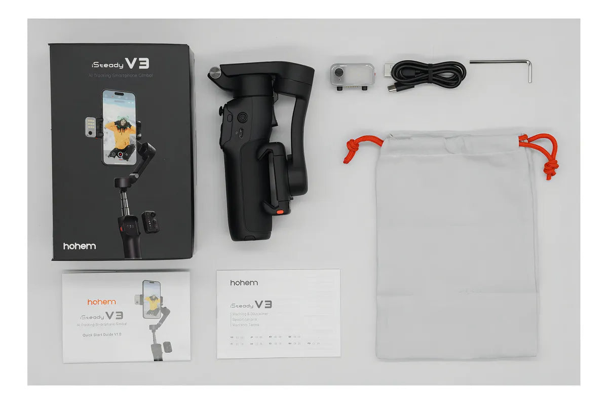 Incluye: estabilizador Hohem iSteady V3, módulo de tracking y luz, cable USB-C, bolsa de transporte, garantía UNICOEXPRESS.